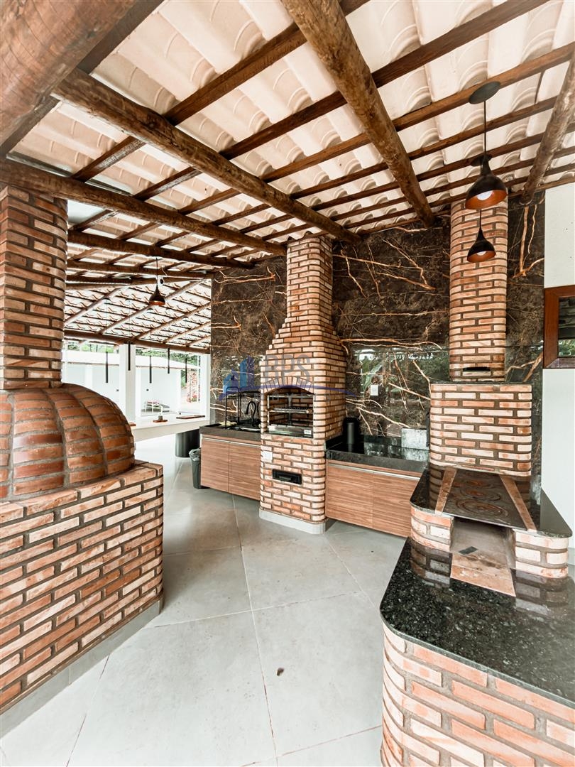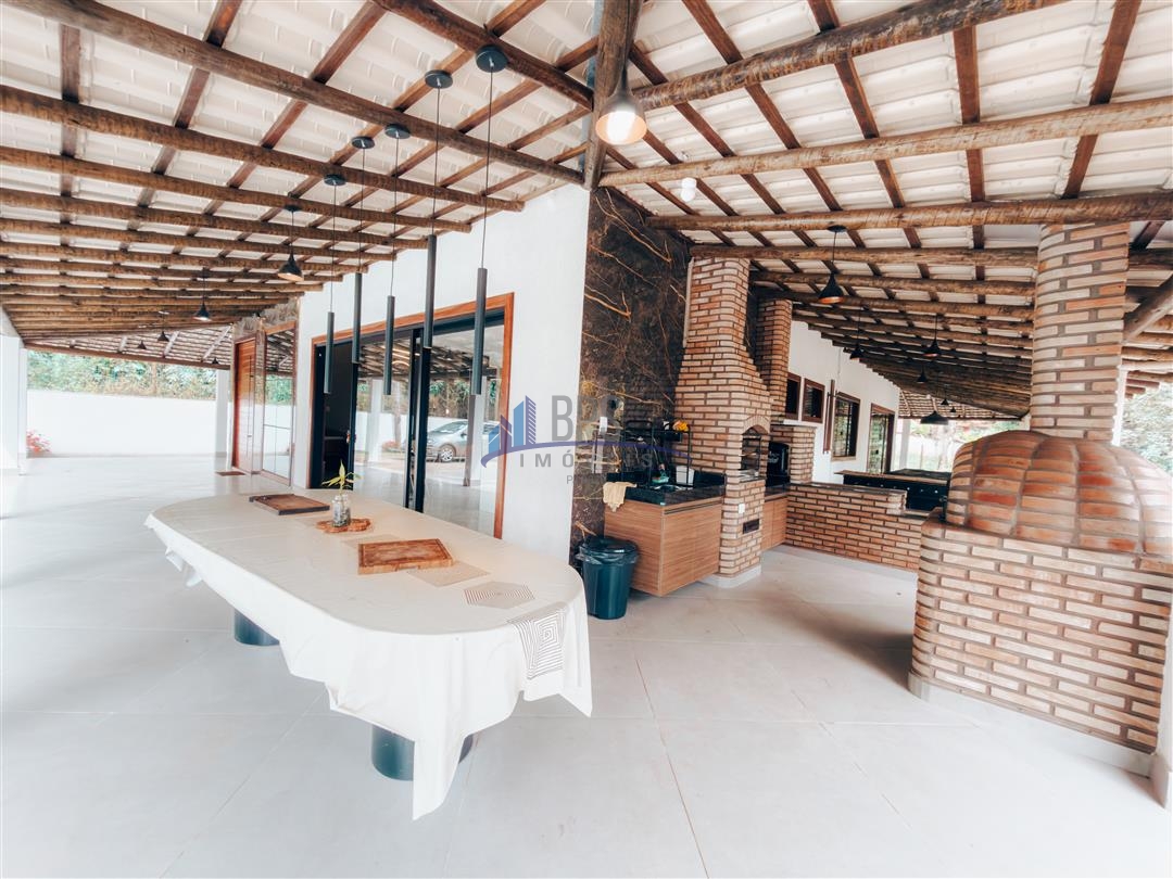 Varanda gourmet com churrasqueira, fogão a lenha e forno