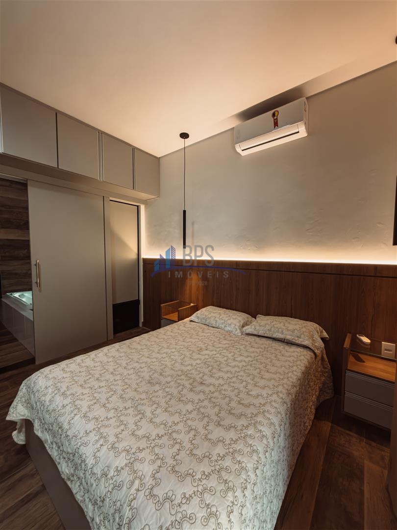 Suíte master com armários planejados, banheira de hidromassagem e ar-condicionado